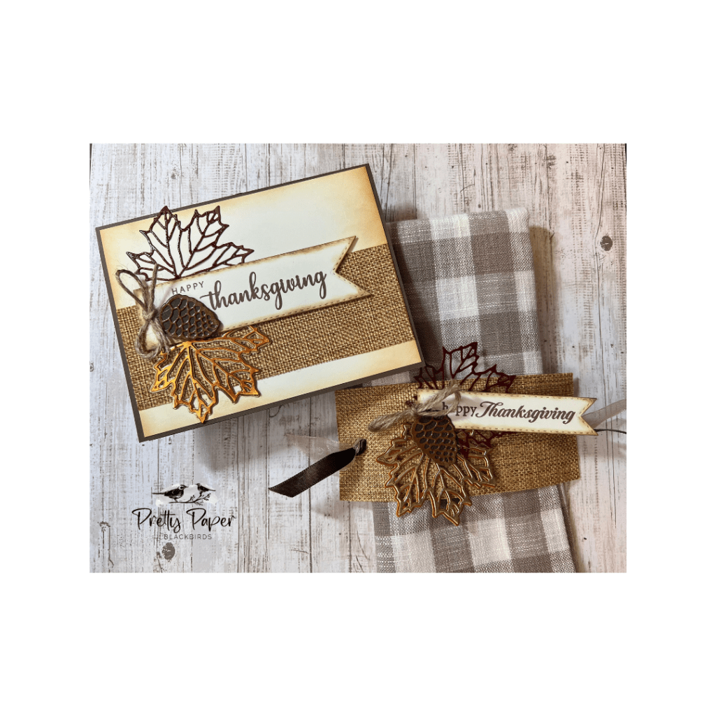 Check out my YouTube video here for complete instructions to die cut, emboss and assemble this card. The place setting requires only a few additional crafting items and a different, smaller “Happy Thanksgiving” greeting so it is more proportionate with the overall smaller size of the project. I used a small hole punch to punch the holes on each side of the burlap backing paper, then layered the ribbons and threaded them through each side of the backing paper, from back to front. I knotted the ends to create a slight bend in the burlap to give the piece some added interest. You could also tuck your silverware behind this backing for a complete silverware setting!