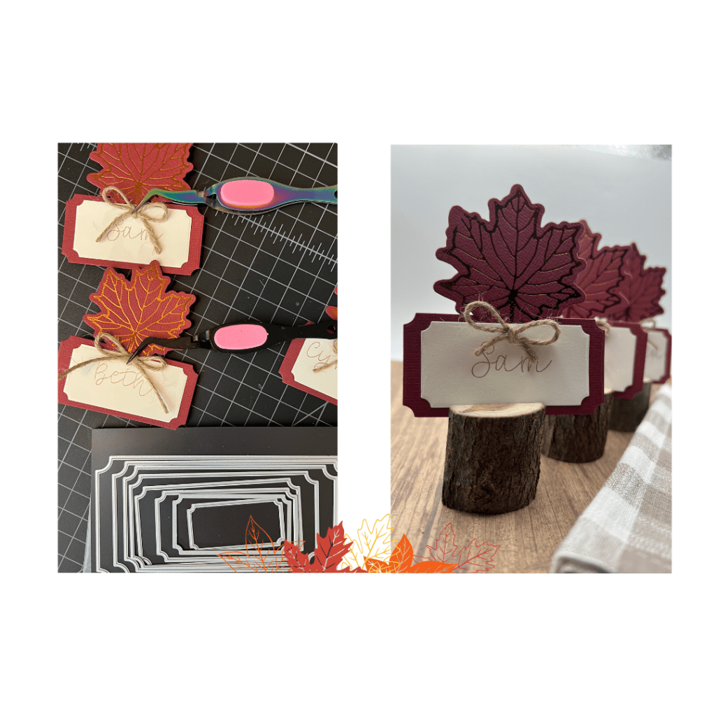 Here is the bonus Thanksgiving project #2 from the Rustic Thanksgiving card series. I used the foiling plate and outline die from the Trinity Stamps Maple Leaf Layers die set to foil and die cut the maple leaves from rust 100# cardstock. I foiled the names with my Cricut using an elegant font without outline, the medium foiling tip and copper foil. I foiled these on cream cardstock and then die cut the name tags with the second largest die. I cut a slightly larger frame from rust cardstock as a background to the tag. My wonderful hubby cut the name tag holders from a branch he pruned (and thankfully saved) earlier this fall. A tiny jute bow completed the rustic look of these name tags and helped to coordinate the look with the place settings. Now that the table setting is complete, time to start on that menu….