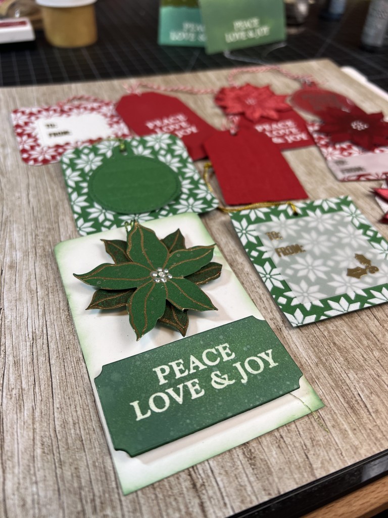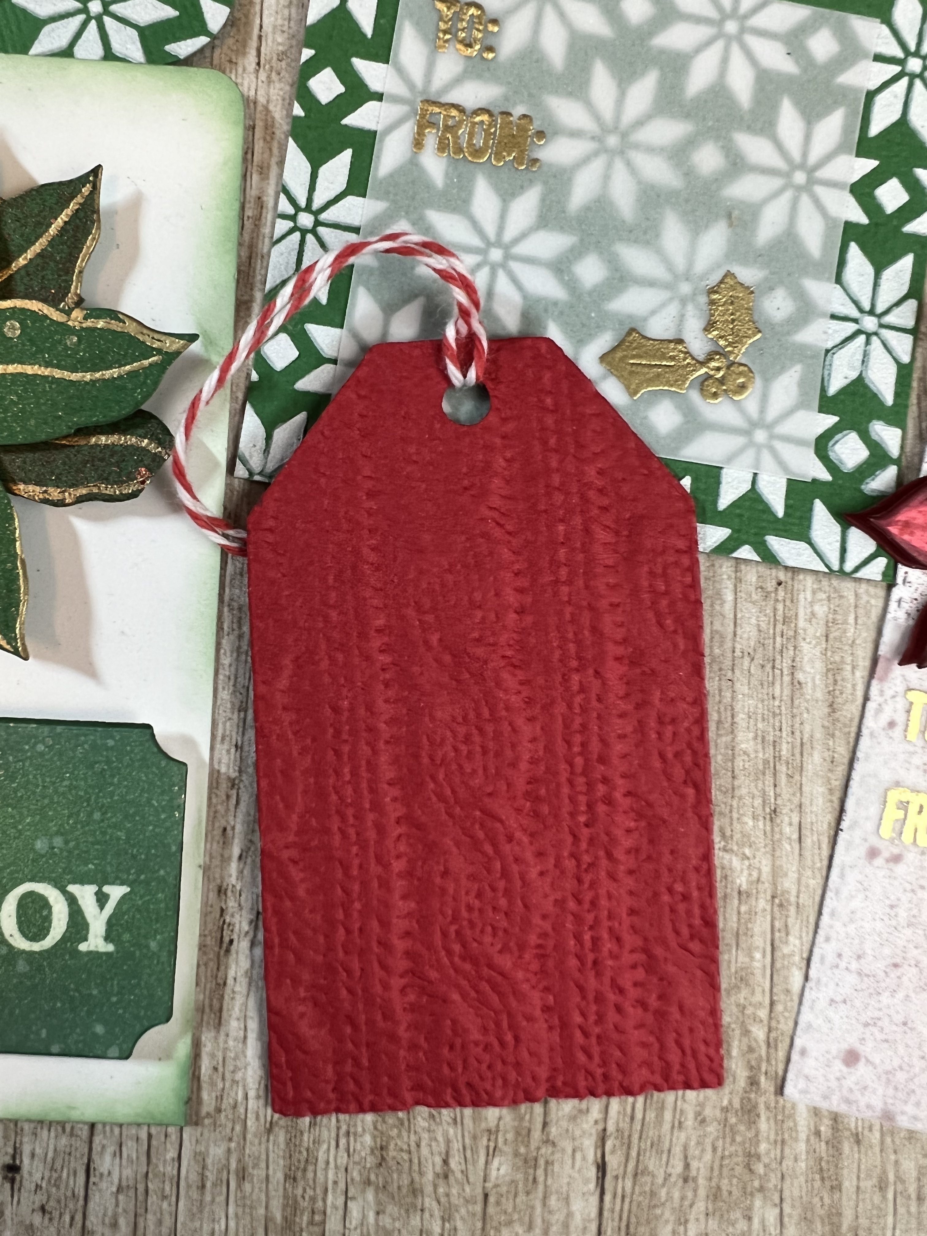And of course I had to use the poinsettia stencil again. I loved this textured background in the original series of cards and I knew I wanted to use it again on the tags. I stenciled both the cranberry and pine cardstock with the stencil and paper glaze, cut the tags to size with a tag die and then created various overlay layers with vellum or white cardstock for the “To:” and “From:” stamps. I had so many ideas for this background…Have you ever had so many ideas that you just know you can’t possibly remember all of them? Yes, that happened.