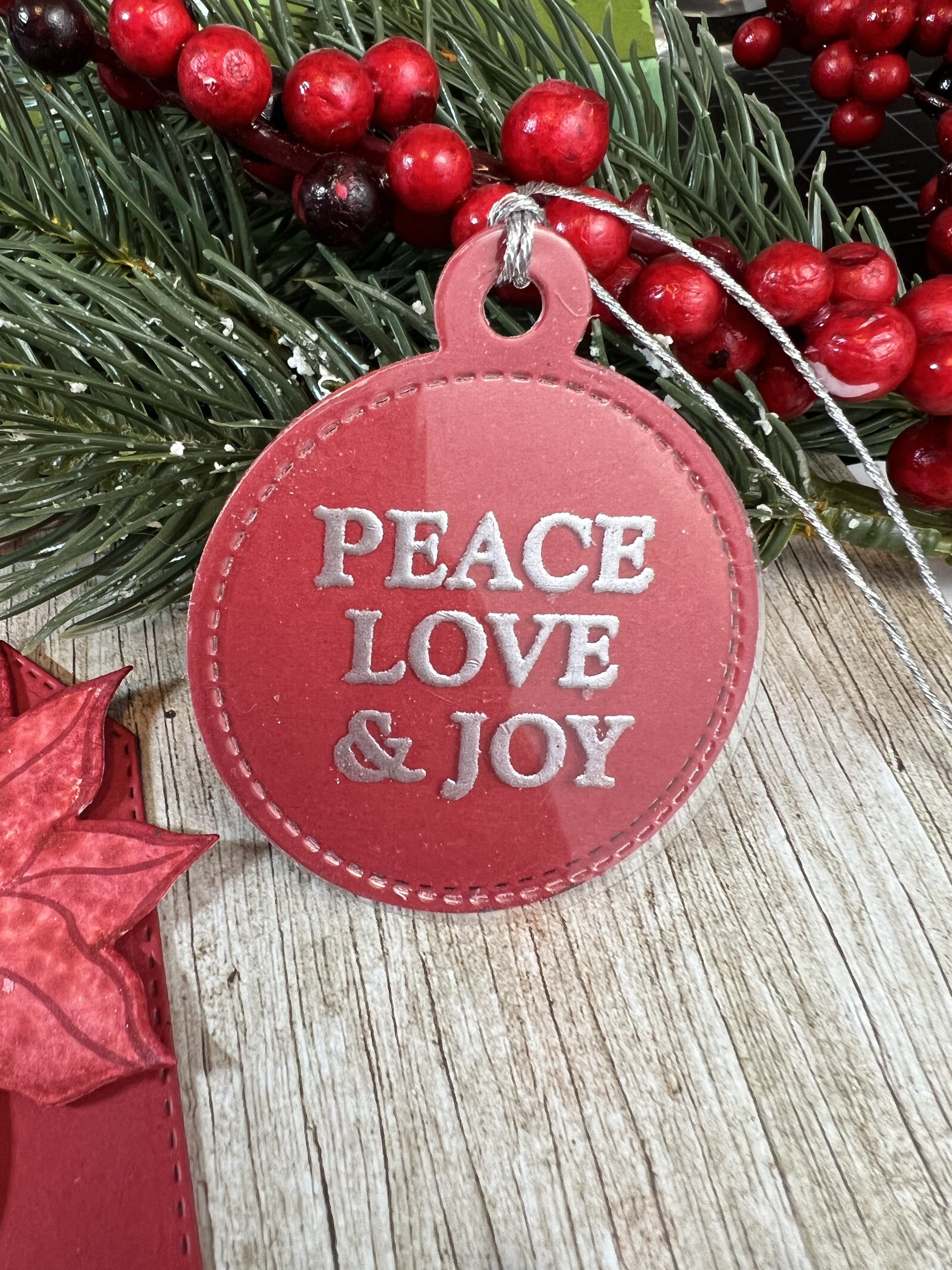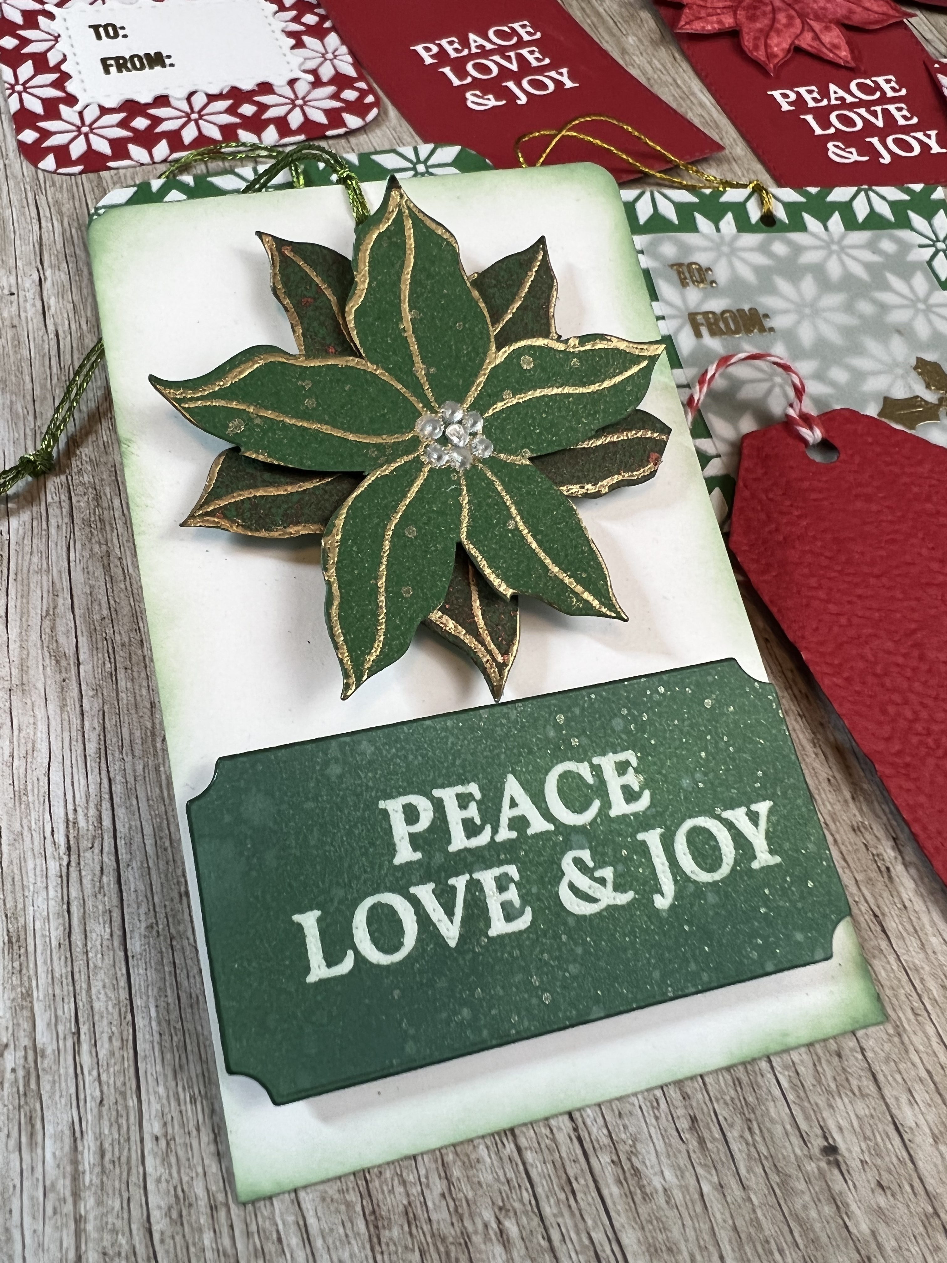 My favorite tag is the green 3-D poinsettia that pops off the tag with gold embossing, a spray of brushed pewter mica spray and some Pops of Color dots. I heat embossed the sentiment with white detail embossing powder and inked the edges of the tag with Distress Oxide ink in Rustic Wilderness. I used foam squares to pop up the top layer of the poinsettia and curled the edges of the leaves just a bit. The colors in this tag feel so holiday-ish and I really love it.