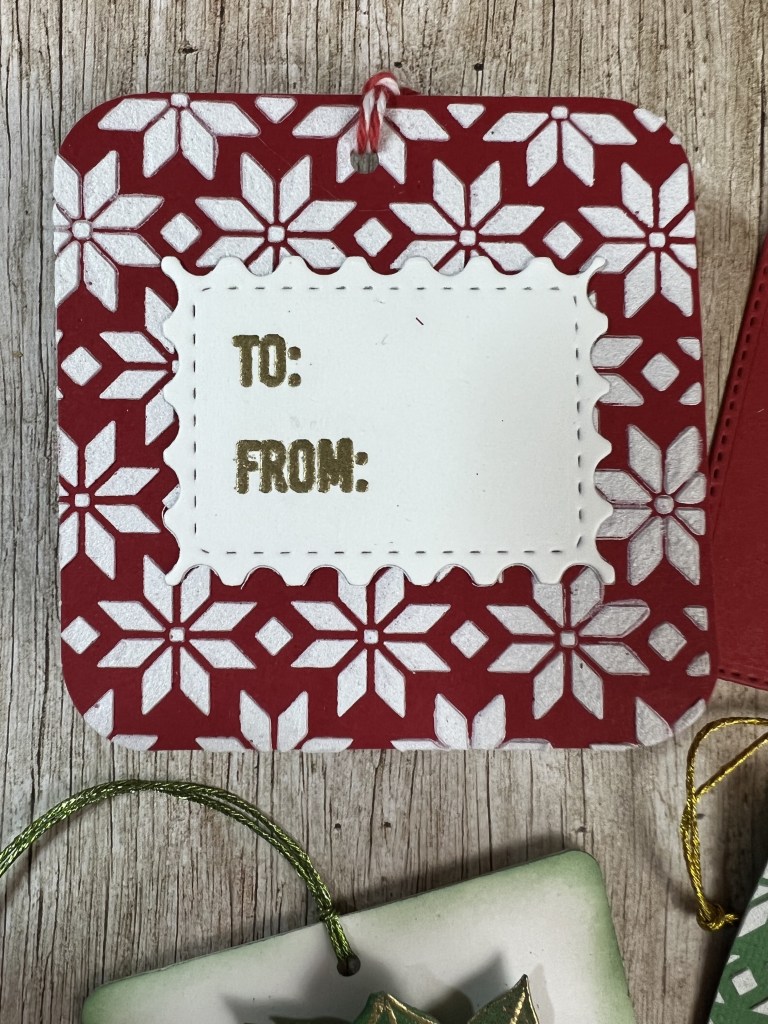 The simplest tag (by far) was the sweater texture tag. I cut two tags to size with a tag die, misted one lightly with water, placed it in a 3D sweater texture embossing folder and then ran it through my die cut machine. I stamped “To:” and “From:” on the second tag and glued the second tag on the back of the embossed tag. This is one that can be mass produced very quickly in various colors and it is super cute.