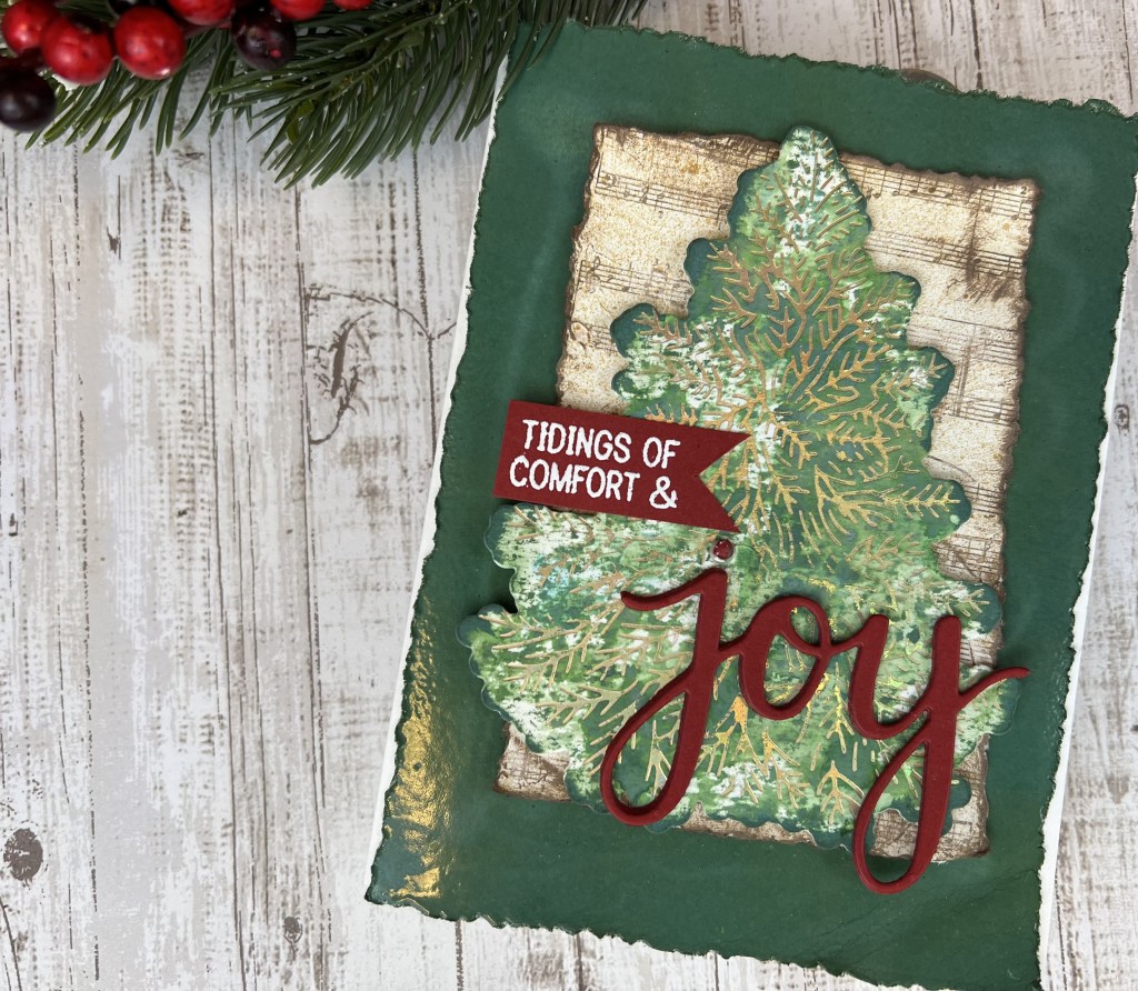 For a card base I used a heavy white cardstock cut to 5 1/2″ x 8 1/2″, scored at 4 1/4″. I folded and pressed the scored edge and used a strong liquid adhesive to apply the glazed layer to the card base front. I did not apply adhesive near the edges of the glazed layer as I really love how this layer has so much dimension and curls up slightly on the edges. This adds to the mixed media look that I was going for with this card. I then added the music layer in the center of the glazed layer. The last layer, the tree was applied using foam squares for even more dimension. I finished off this card by adhering the greeting strip and “joy” die cut near the bottom of the foiled tree. I applied the dot over the “j” using a dot of Pops of Color rather than trying to glue together three small dots.
